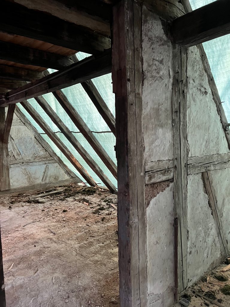 Mit dem Baubeginn ergeben sich ganz neue Sichten. Alte Spriegel, die unter dem alten Putz geschlummert haben, kommen zum Vorschein… und ganz hinten lugt die Iptinger Kirche durch