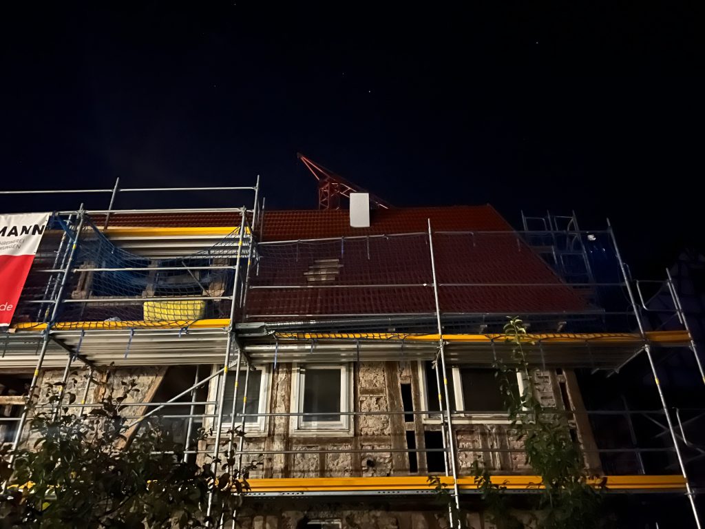 Das geht jetzt ganz schön schnell: Kaum steht das Gerüst, ist das Dach auch schon abgedeckt. Eine Bauplane schützt vor Regen, der dieses Jahr aber eigentlich ausgeblieben ist. Warum sollte er genau jetzt kommen?