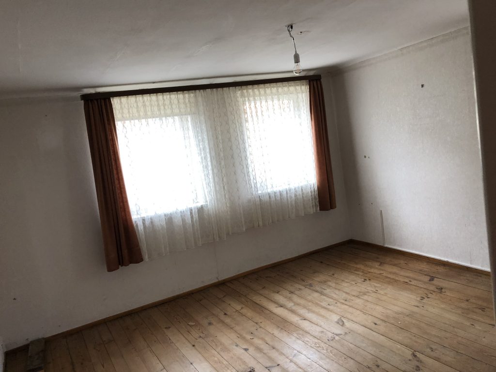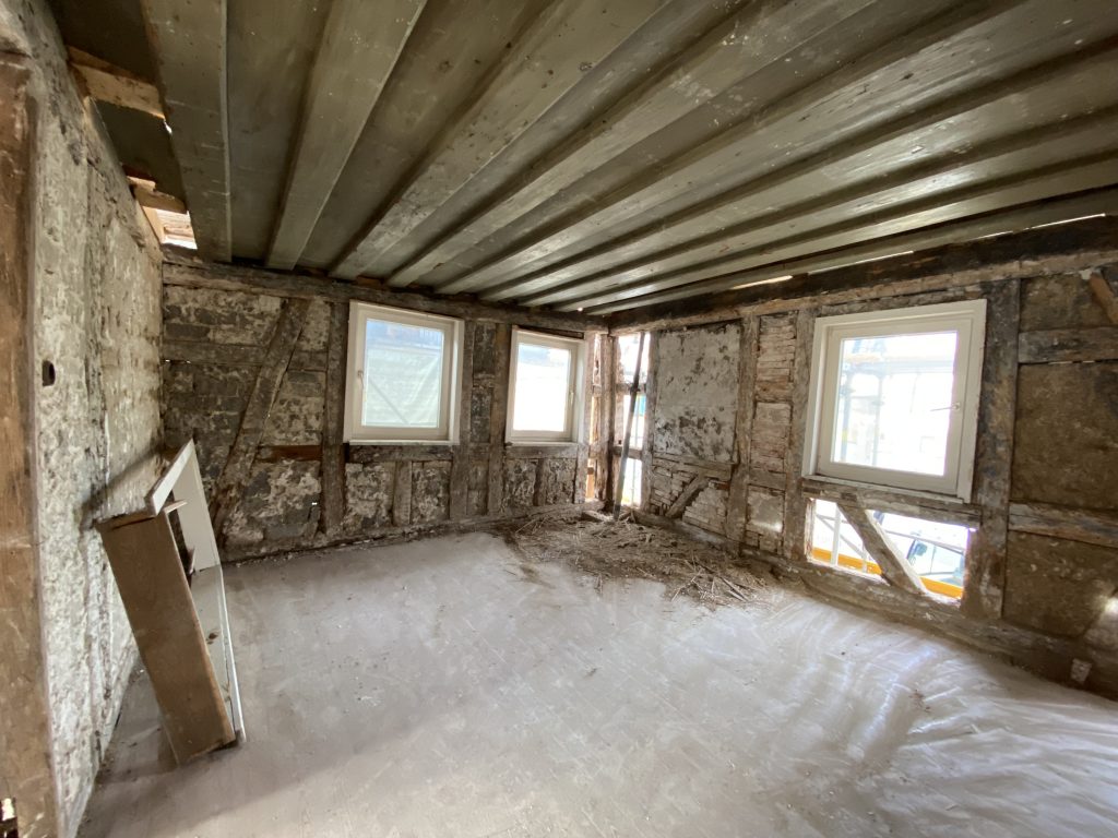 Bei der Dachsanierung sind Deckenbereiche in der Wohnebene sichtbar geworden. Wir waren schon alle recht elektrisiert, als plötzlich eine alte Holzdecke zum Vorschein kam. „Nun wissen wir, wo die Gute Stube war“ sagte unsere Architektin. Mit Hammer und Stemmeisen habe ich die wohl in den Vorkriegsjahren aufgebaute Zwischendecke wieder abgerissen. Die hatte man zur Dämmung eingezogen und auch schön mit Holzschrot aufgefüllt. Mit dem Entfernen der Zwischendecke wird das Zimmer jetzt auch noch ca. 20 cm höher, was für mich natürlich toll ist.