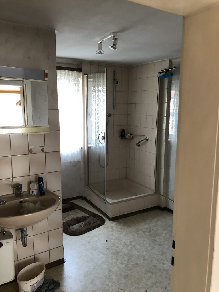 Das dürfte wohl der letzte größere Rückbau von Änderungen in der Grundstruktur des Hauses sein. Aus dem Bad mit anliegender Toilette wird mal unser Ankleidezimmer. Jetzt noch bißchen die Wände machen, Fußboden rein und Decke neu – und schon wird das neue Zimmer fertig sein 🙂