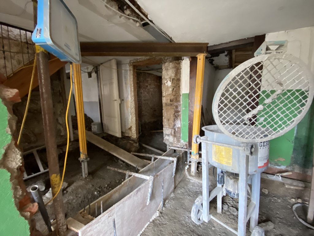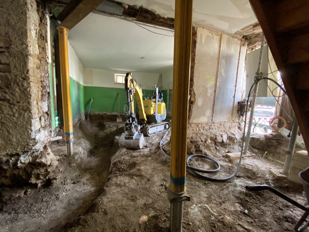 Der nächste Bauabschnitt geht auf den Abschluss zu. Im Erdgeschoss wurde alles ausgebaggert und Dämmplatten eingelegt. Wo notwendig sind auch die unteren Bodenbalken abgestützt. Hier hatten wir befürchtet, dass ein Hauptbalken am Boden ausgetauscht werden muß. Da hatten wir mal Glück, dass er doch nicht zu morsch war. Schon unglaublich, was so eine Eiche im Boden alles über Jahrhunderte aushält.