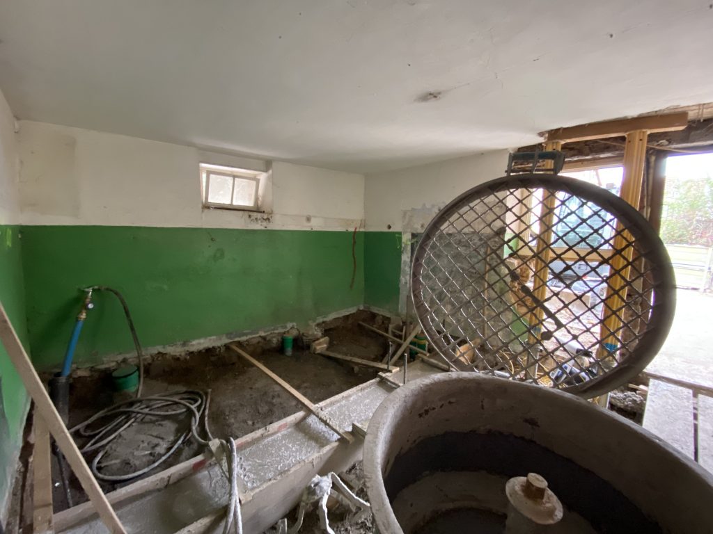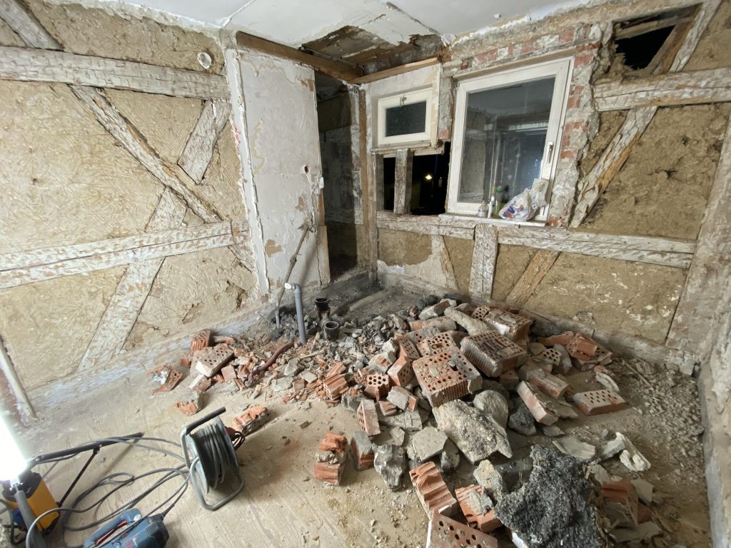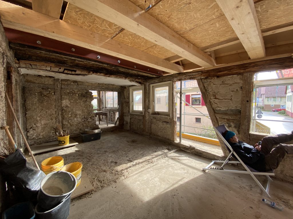 Eine Überraschung gäbe es dann aber doch noch – bei der Tür zum alten Öllager hat man den Stützbalken so tief beschädigt, dass wir hier wohl zu mauern werden und die Tür an eine andere Stelle setzen müssen. Die Überraschungen hören also nicht auf…