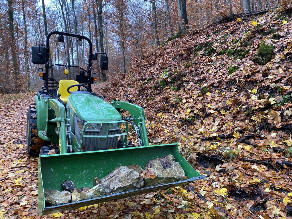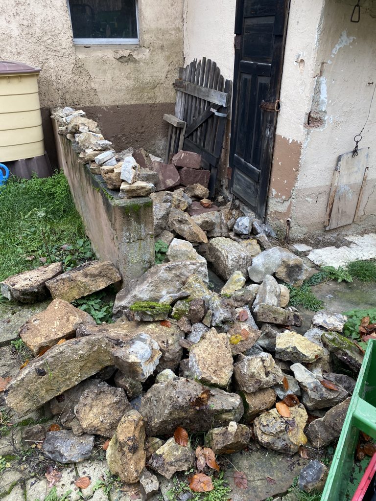Zur Abgrenzung des Wirtschaftsraumes zum Flur im Eingangsbereich haben wir uns entschlossen, eine Steinmauer zu setzen. Im Hof und bei eingerissenen Mauern im Haus haben wir zahlreiche Steine dafür gefunden. Und dann wäre ich mit dem Schlepper beinahe auch noch über einen großen Stein gefahren. So etwas gefährliches gehört natürlich weggeräumt…