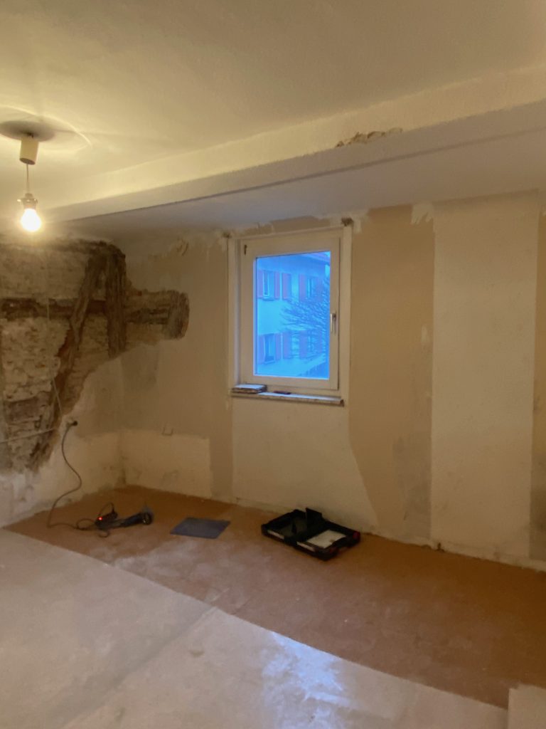 Zwischenzeitlich habe ich im Gewölbekeller versucht, mit der Elektrobürste die Steine zu reinigen. Viel Staub und wenig Erfolg… Dann haben wir angefangen mit Hammer und Meißel den alten Putz zu entfernen. Eine Sauarbeit! Das ist das erste Mal, dass wir ein Gefühl bekommen, was so alles an Arbeiten auf uns wartet. Auch stellten wir fest, dass es sich doch sehr lohnt, über eine Professionalisierung der Vorgehensweise nach zu denken. Jetzt ist erst mal der Putz in einem kleinen Bereich bei den Fugen zwischen den Felssteinen ab. Dahinter ist Lehm. Nun rätseln wir ob das so Sinn macht. Für ein neues Verputzen schein es erforderlich zu sein. Eine gründliche Reinigung der Felssteine mit einer Drahtbürste ist recht unpraktisch. Ich denke es lohnt sich mal nach einer Firma zu suchen, die ggf. auch eine Reinigung mit dem Sandstrahler macht.