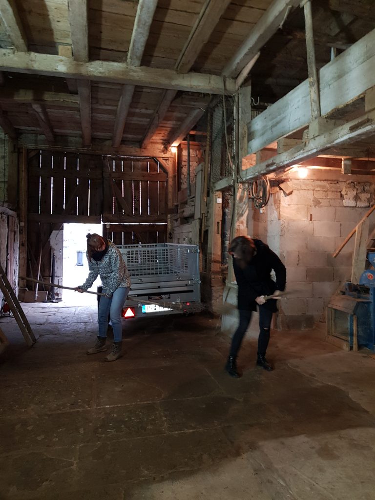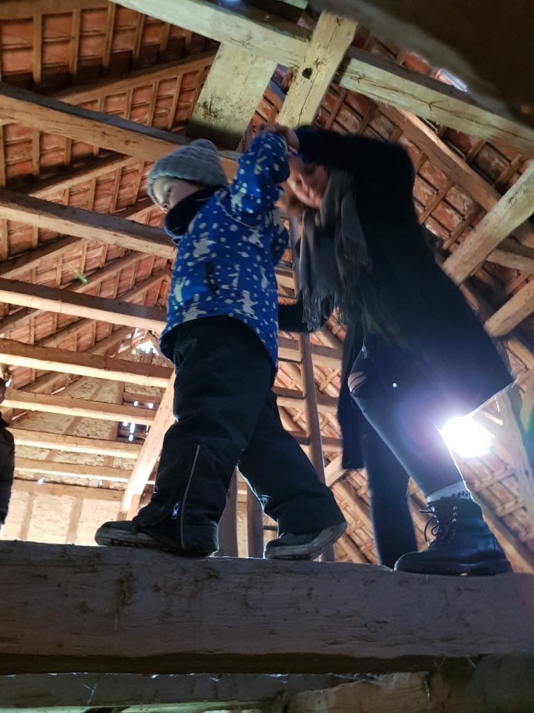 Heute bestaunt Judit unser „Anwesen“ … sie hat ihre Freundin Jolle mitgebracht. Wir klettern mit den beiden bis unters Dach der Scheune. Judit balanciert auf den dicken Balken des Dachstuhls. „Ein Riesenkinderspielplatz!“, strahlt sie. Mal sehen, ob sie das nächste Woche auch noch sagt, wenn Mattis den Riesenspielplatz erkundet. Am Ende entdecken Jolle und Judit zwei alte Reisigbesen, mit denen sie durch die Tenne fliegen, äh… reiten.