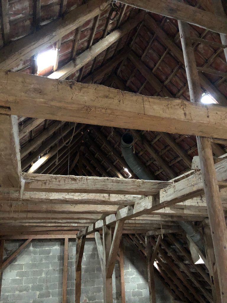 Torsten hat noch die alten Lüftungsrohre ausgebaut und zum Schrott gebracht. Bei einer Kletterübung musste er unter das Scheunendach. Trotz der Kälte gab es ordentlich Angstschweiß wegen der Höhe. War nicht lustig… 😉