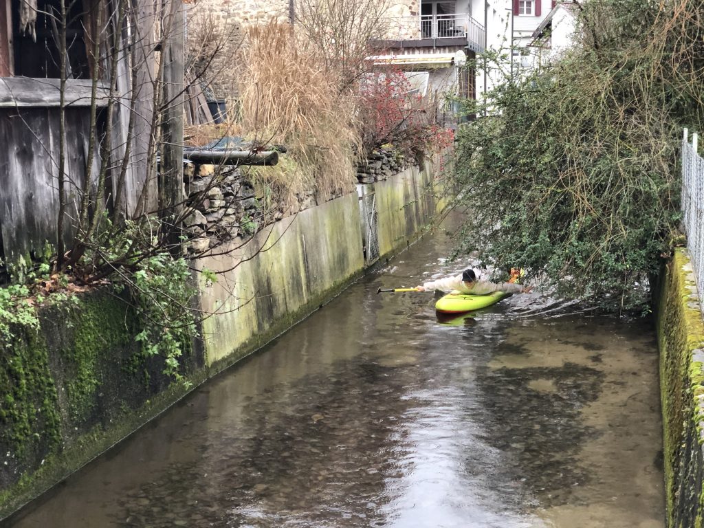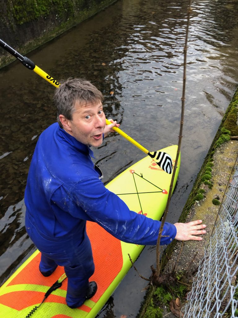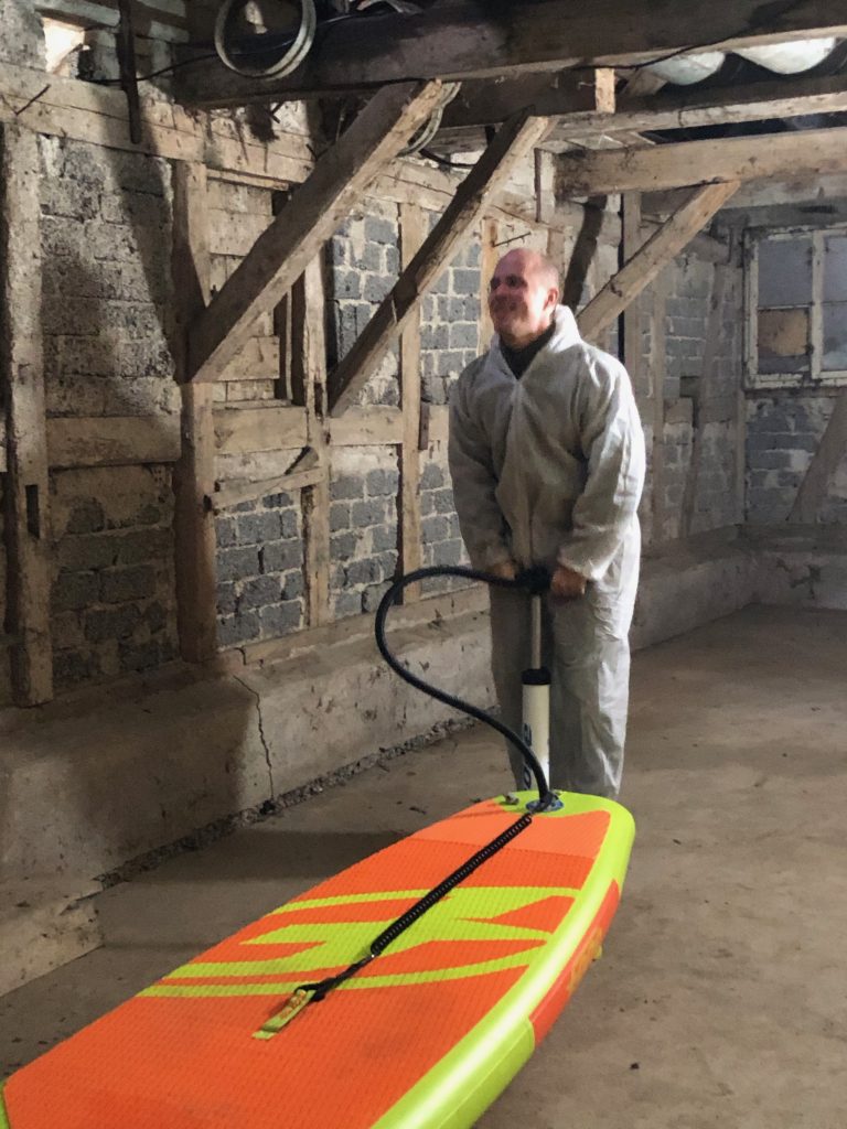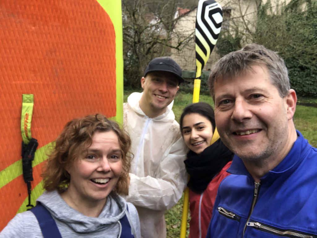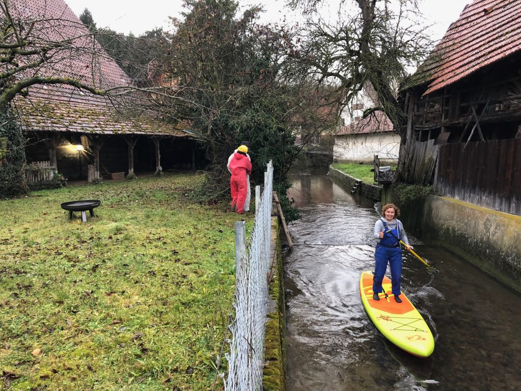 Nach unserem aktiven Aufräumwochenende in der Scheune gönnen wir uns noch eine kleine Abwechslung auf dem Kreuzbach. Torsten holt eines unserer SUPs von zu Hause. Wir ziehen Neoprenschuhe an und los geht’s 🙂 … Wer hätte das gedacht, auf dem Kreuzbach kann man ganz hervorragend Suppen!!!