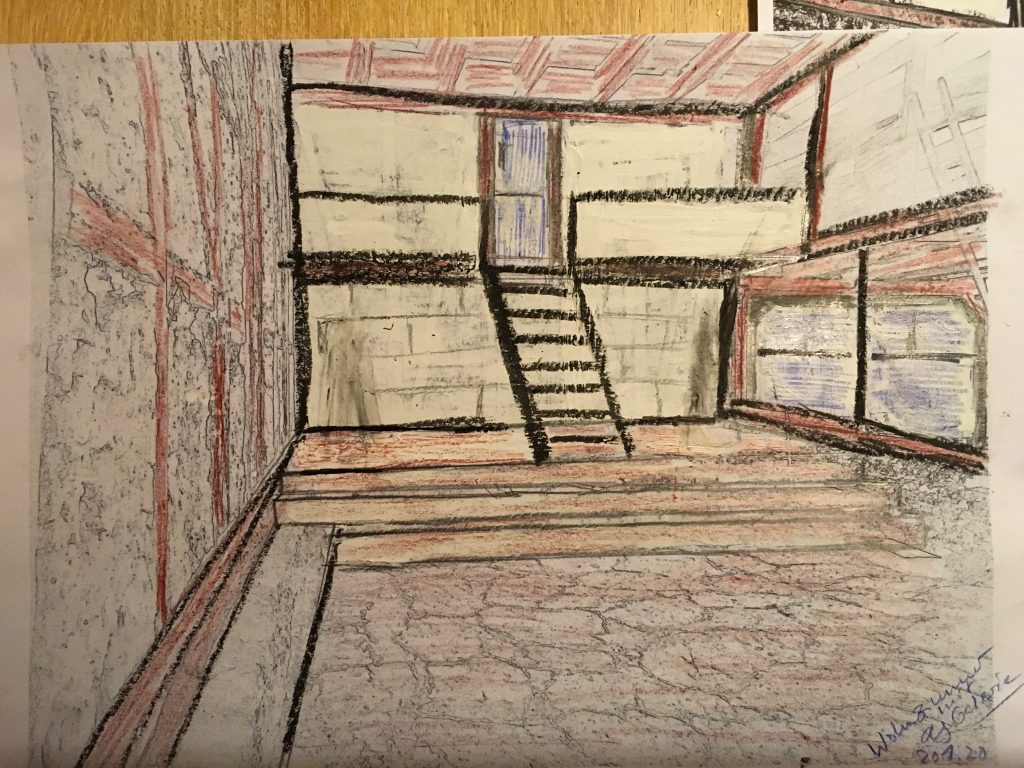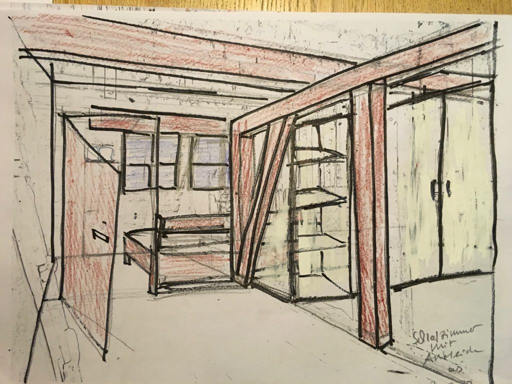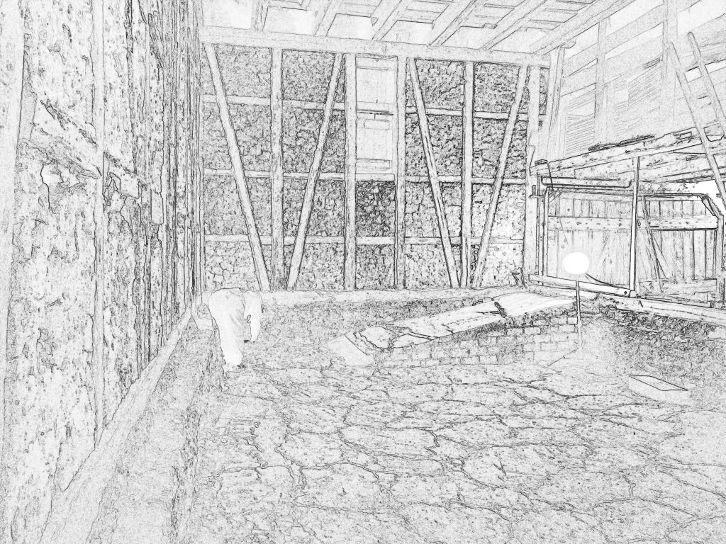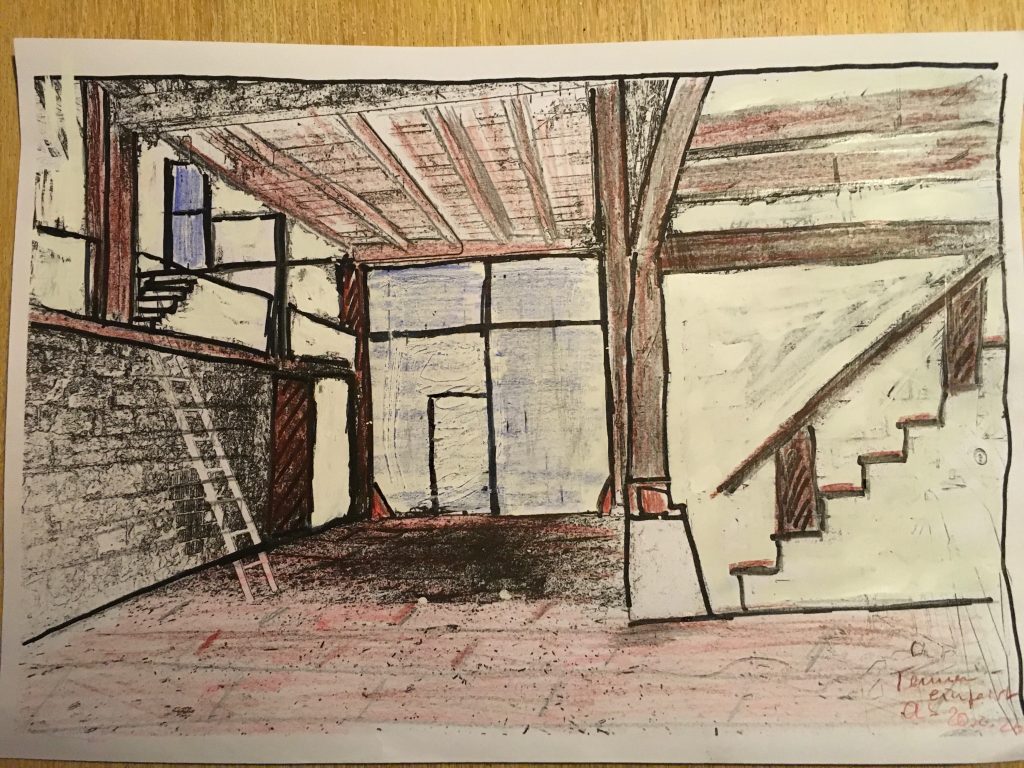 Torsten und ich haben überlegt, wie wir uns der Gestaltung der Scheune weiter nähern können. Dabei sind wir auf die Möglichkeit gestoßen, Fotos als Konturendarstellungen auszudrucken und dann ganz altmodisch mit Buntstiften zu bearbeiten. Das hat den Vorteil, dass die Größenverhältnisse einigermaßen getroffen werden und noch viel wichtiger: die Perspektive … es ist nämlich gar nicht so einfach, perspektivisch zu zeichnen, wenn man das sehr lang nicht gemacht hat…