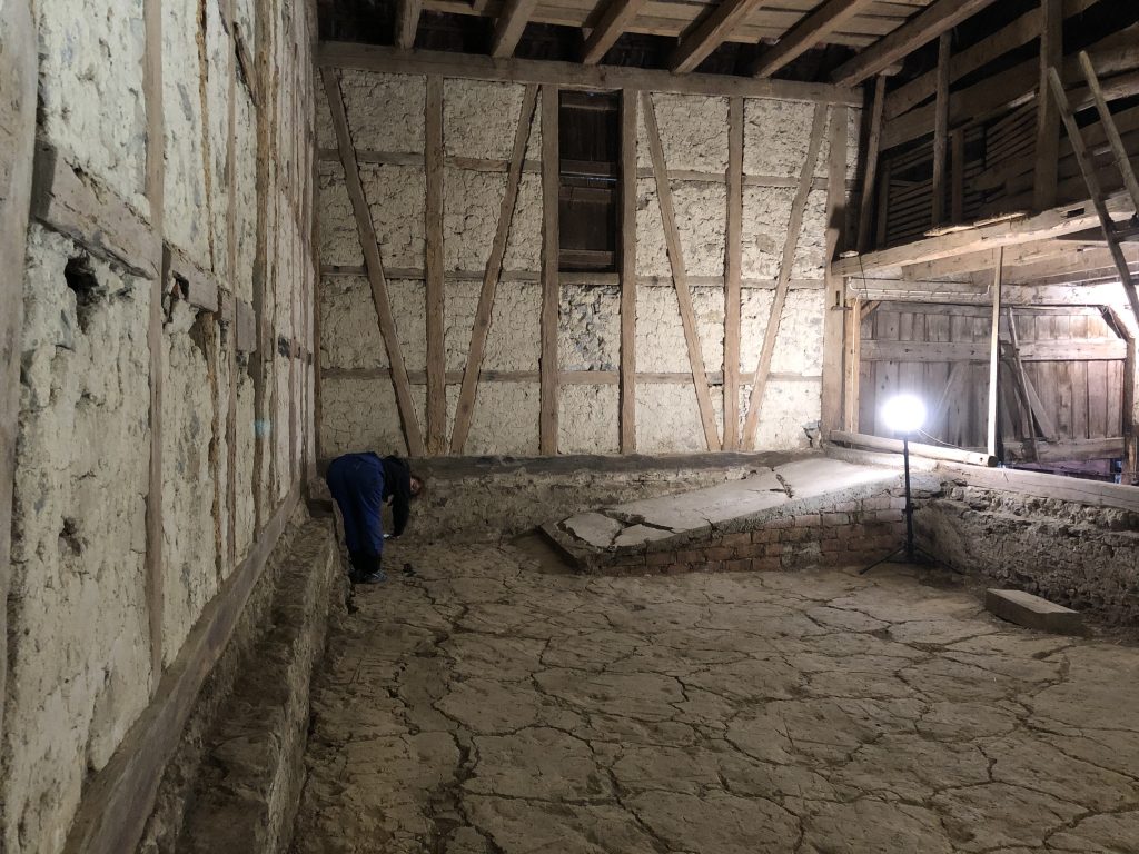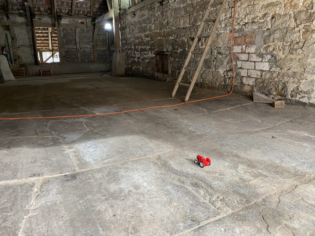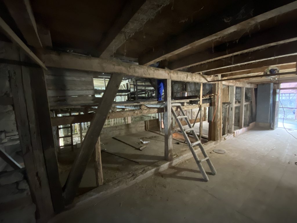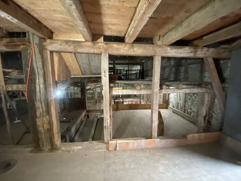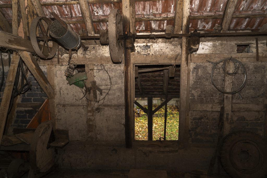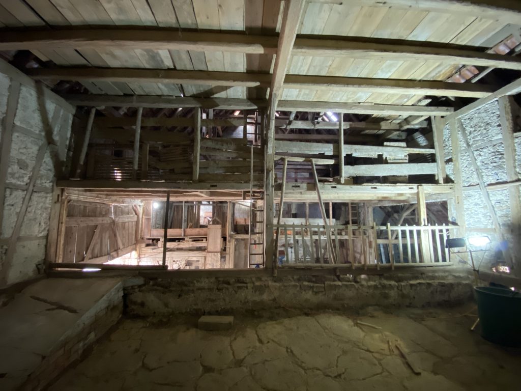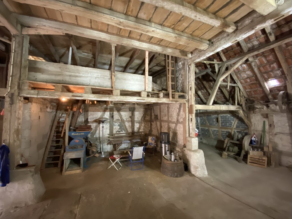 Nachdem wir auch die Heupumpe demontiert hatten, gibt es nur noch die alte Holzsäge in der Scheune. Auch die wird noch raus kommen. Was wir erhalten wollen, ist der alte Riemenantrieb über dem Ausgang zum Garten.