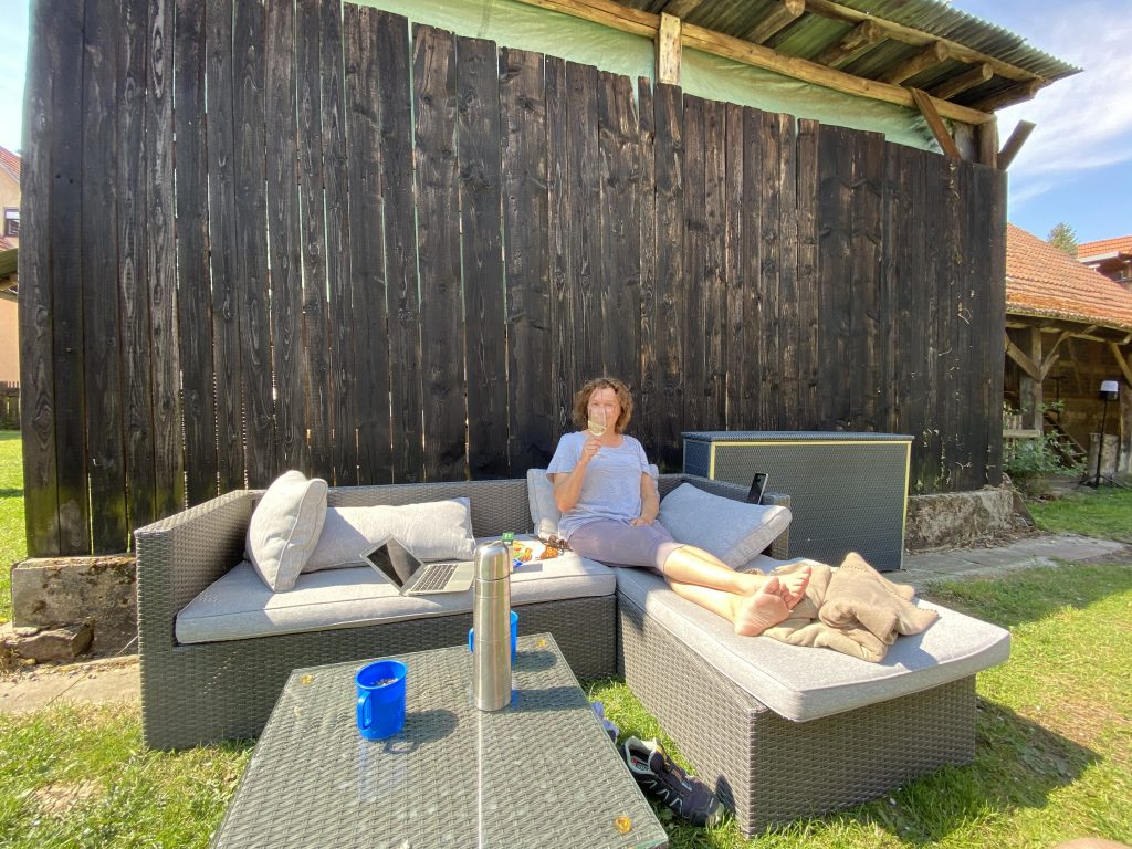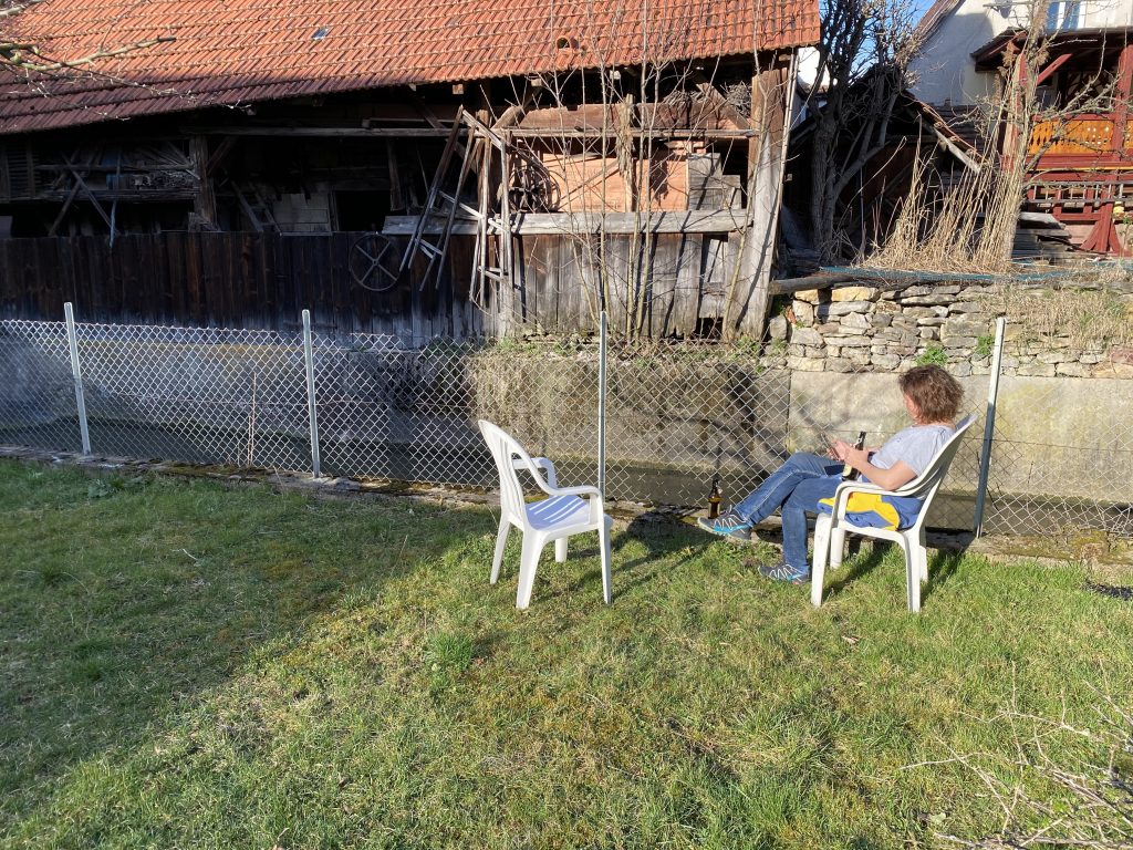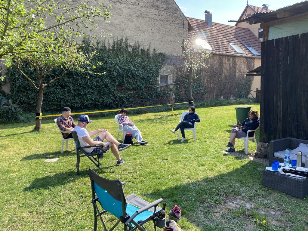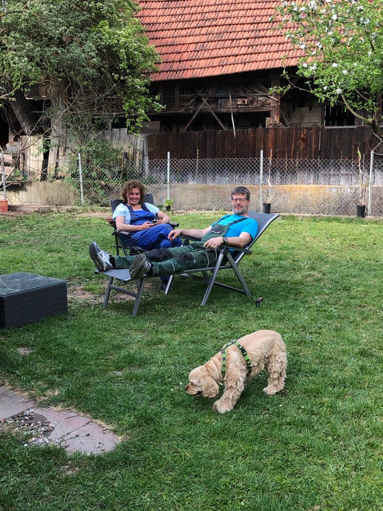 Dafür hat uns unser neues Anwesen aber auf das schönste entschädigt. Wir haben die Lounch von unserer Terrasse hinter die Scheune an einen halbschattigen Ort gesetzt. Dann noch Stühle aufgestellt und schon wurde es richtig gemütlich. Da konnten selbst Freunde vorbei schauen und es war genug Platz, um reichlich Abstand zu halten. Dann hat Melisa noch einen Kuchen gebacken und mit Wein und Bier war die Osterfeier perfekt.
