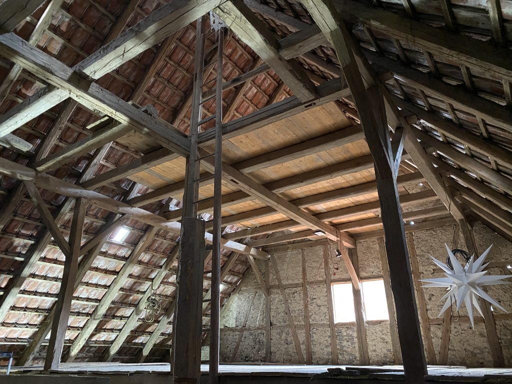 Im Januar hatte ich die Zwischendecke mit den Sägespänen aus dem Schweinestall entfernt. Nun lag das ganze Holz auf dem alten Anhänger rum und die Frage stand im Raum, was damit wohl geschehen soll. Zum verheizen einfach zu schade. Uns kam die Idee, als Zwischenlager den Dachboden zu nutzen. Da gibt es noch eine obere Ebene mit Balken aber komplett ohne Decke. So kommt man auch an die Dachschindeln ganz oben ran, so sie kaputt sein sollten. Vielleicht mehr als nur eine Zwischenlösung…