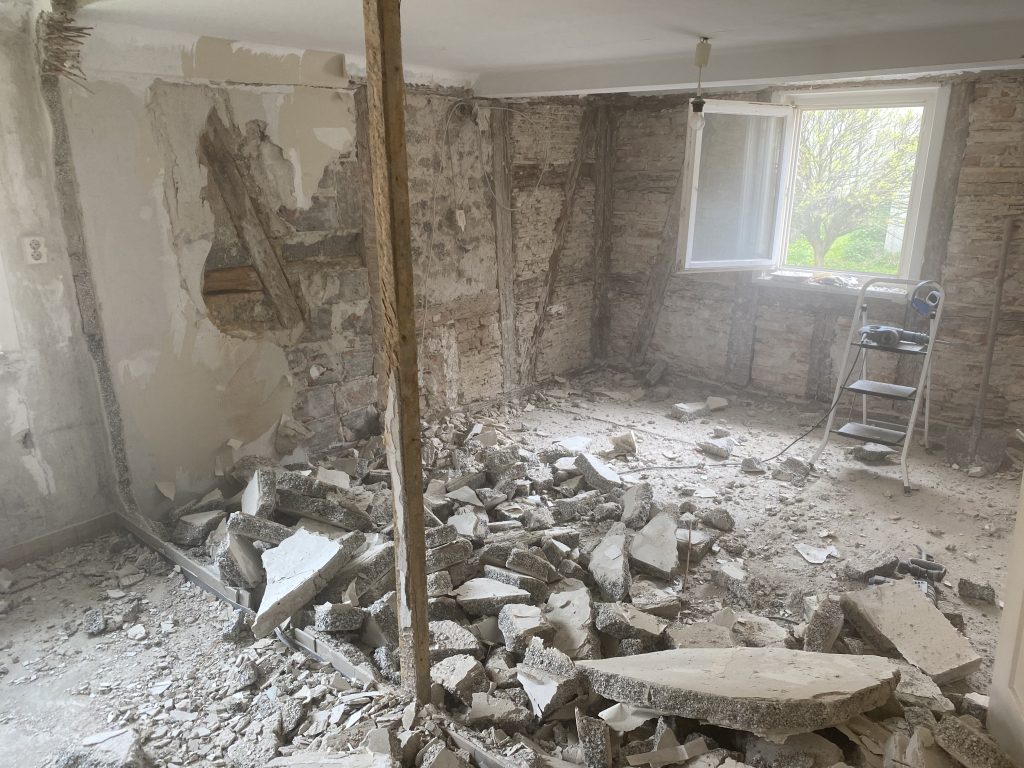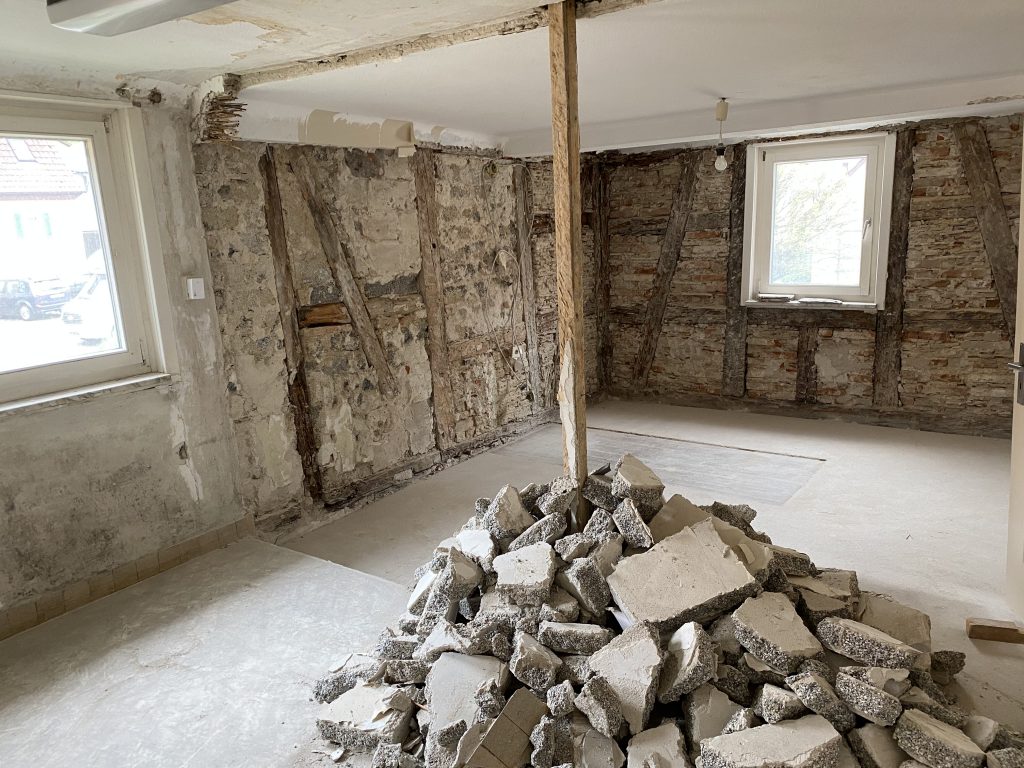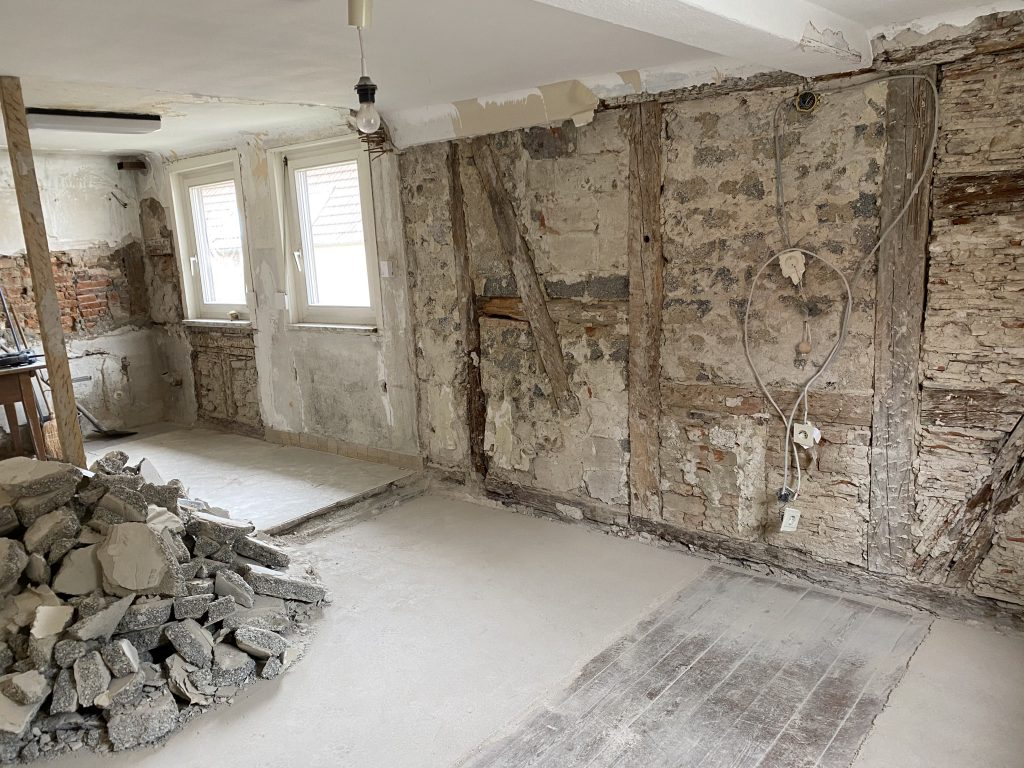 Heute am 15.05. haben wir kräftig im Hof gearbeitet. Roland und Christa sind zu Besuch, so dass wir fleissige Hände zur Unterstützung haben. Gestern haben Roland und ich noch den letzten Hänger mit Dämmmaterial und Gipsplatten vom entfernen Dachzimmer + eine Tour Altholz zur Entsorgung gefahren. So wurde der Hänger frei und wir konnten uns an das alte Schlafzimmer machen. Mit dem Denkmalamt haben wir geklärt, dass wir Putz entfernen können, um den Bestand an Balken frei zu legen und einsehbar zu machen. Auch sind neuere Änderungen (seit ca. 1950) nicht für den Denkmalschutz relevant. Also ran an den Speck und das kommt dann dabei raus…