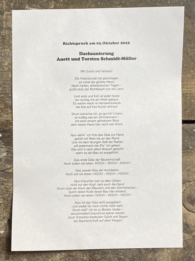 Feste müssen gefeiert werden. Unsere Architektin gab uns kurzfristig den Hinweis, dass genau jetzt der richtige Zeitpunkt für das Richtfest wäre.