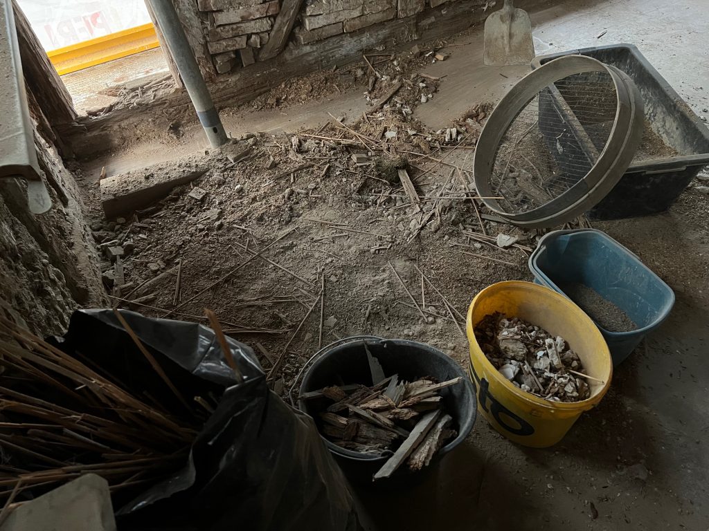 Nachhaltig ist unser Projekt auf jeden Fall! Das Dämmmaterial, das in den Zwischendecken war, wird gesiebt und in vier Teile separiert: Stroh, Altholz, Kalkputz und wiederverwertbares Dämmstreu. Das Dämmstreu lagern wir bis zur Weiterverwendung unterm Dach. Hoffentlich entdecken die Katzen der Umgebung den Haufen nicht als Katzenklo 😉