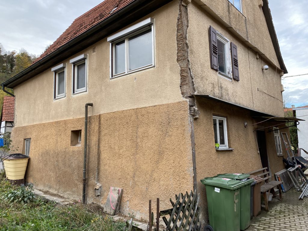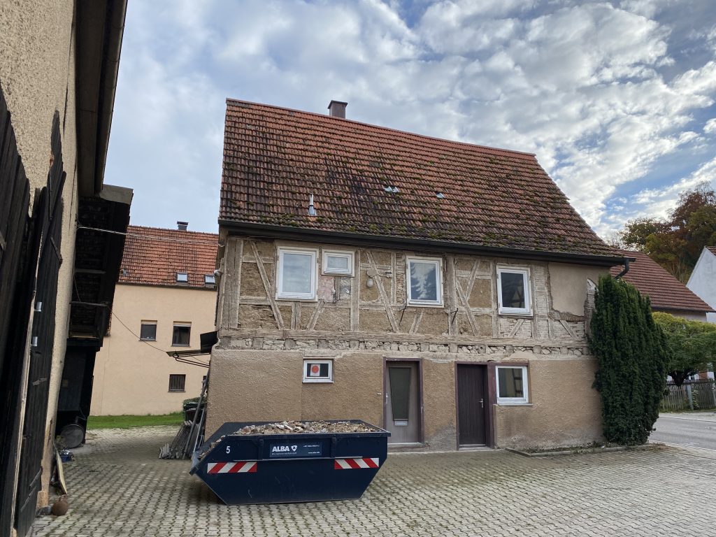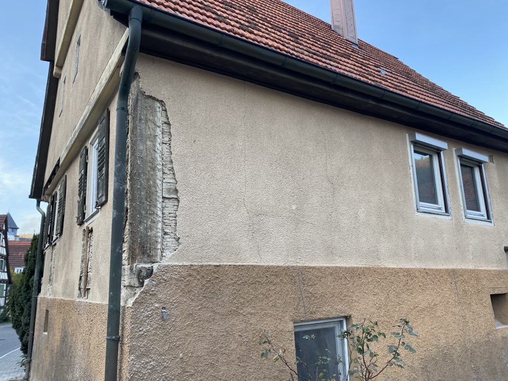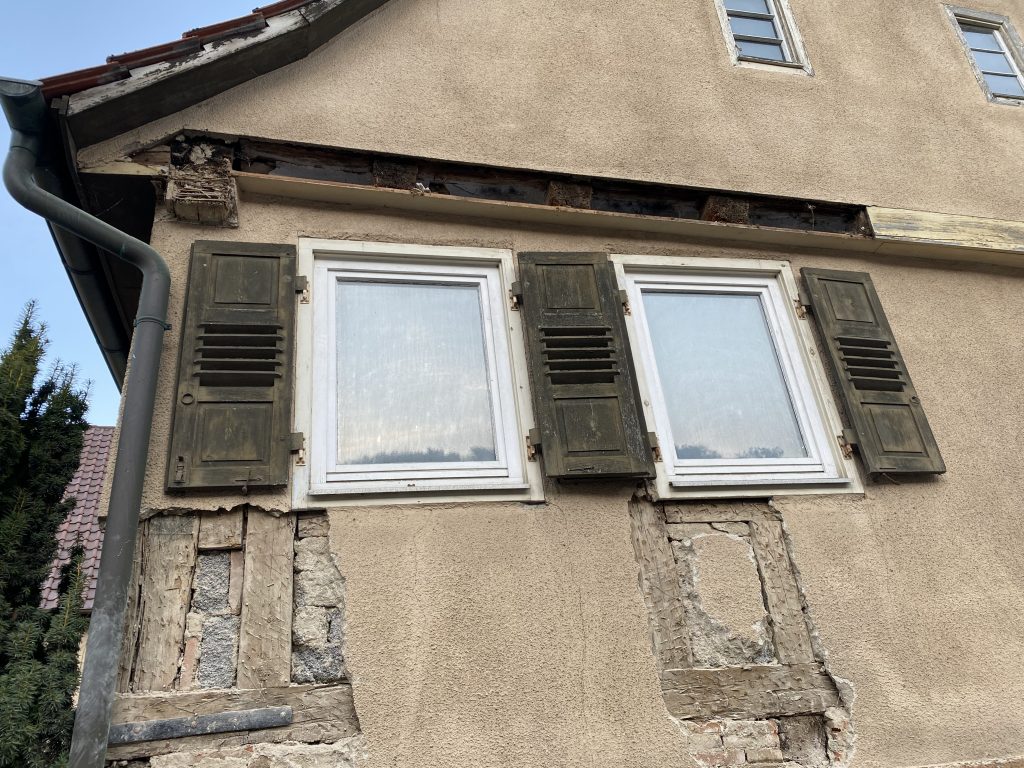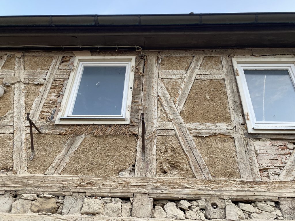 Nicht nur in den Innenräumen hat unser Bautrupp so einiges frei gelegt. Auch Aussen an der Fassade haben sie sich mächtig zu schaffen gemacht. Einerseits sieht das echt toll aus, wenn das Fachwerk sichtbar wird, andererseits konnten wir so feststellen, dass die Holzkonstruktion an wesentlichen Stellen intakt ist. Unglaublich was da für Balken verbaut wurden. Und die haben gaaaanz viele Jahre auf dem Buckel 🙂