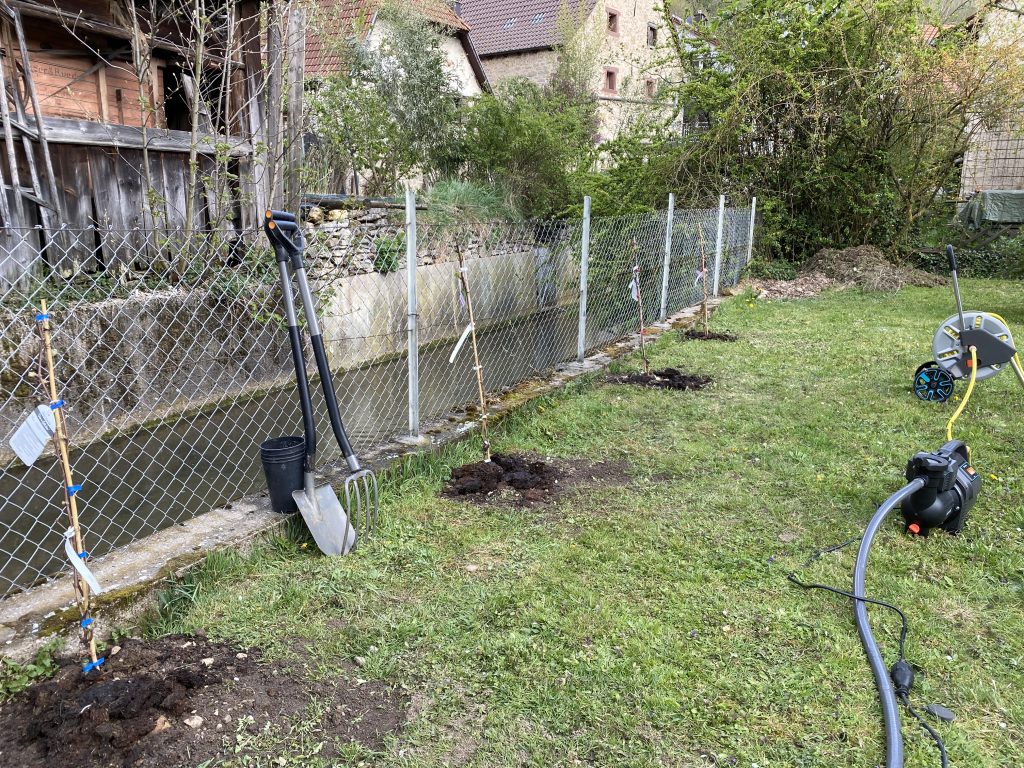 Nette hat vier Weinreben mit gebracht. Die setzten wir vor den Zaun am Fluß. Da hier die Sonne den ganzen Tag rum wandert, sollte sie es mit den Sträuchern ganz gut meinen. Die Löcher für die Wurzelballen habe ich mit unserem tollen Kompost an gereichert. Das muss was werden! Vielleicht wird das ja auch die Grundlage für unsere Besenschänke. 😉